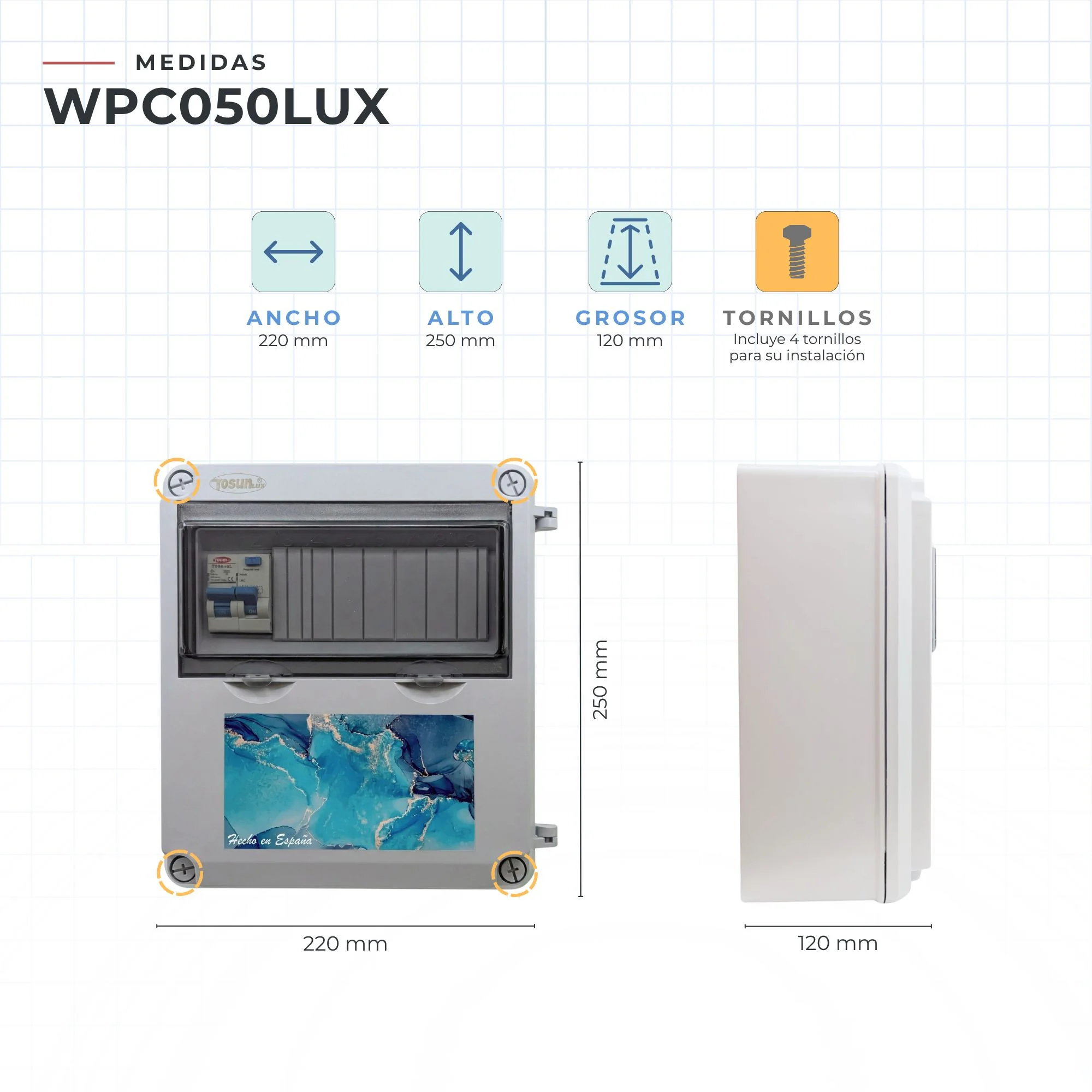 Caja: Fabricada en polímero de alta resistencia a impactos y rayos UV, con tapa transparente que permite visualizar el estado de los componentes sin necesidad de abrir el cuadro.