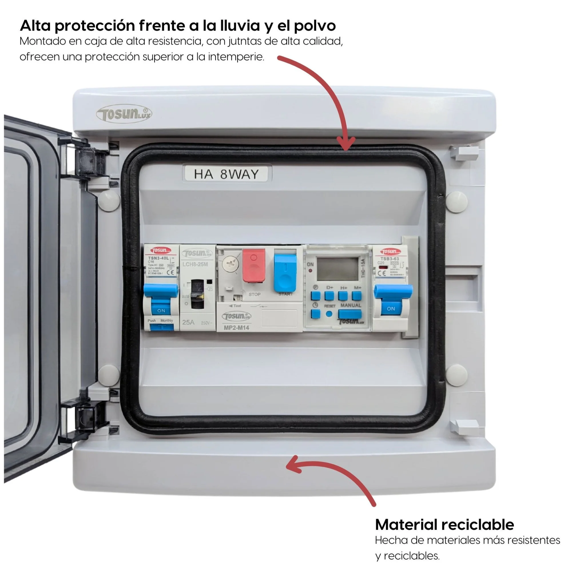 - Caja Premium de Alta Resistencia: El Cuadro Eléctrico está montado en una caja de alta resistencia a la intemperie, garantizando durabilidad y protección incluso en condiciones ambientales extremas.