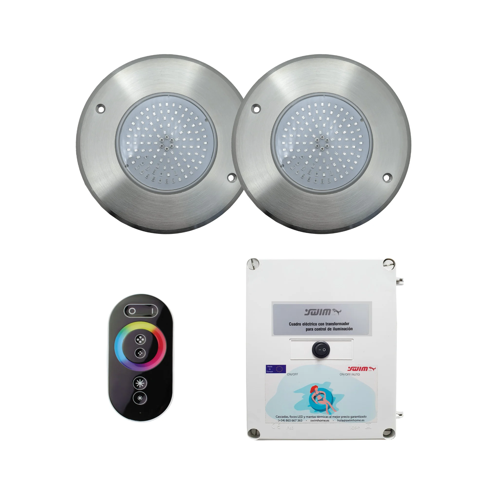 Cada pack viene con un cuadro con transformador de 150W 12V DC con magnetotérmico y diferencial, asegurando una instalación eléctrica segura y eficiente, y una operación sin problemas de los focos LED en su piscina.
