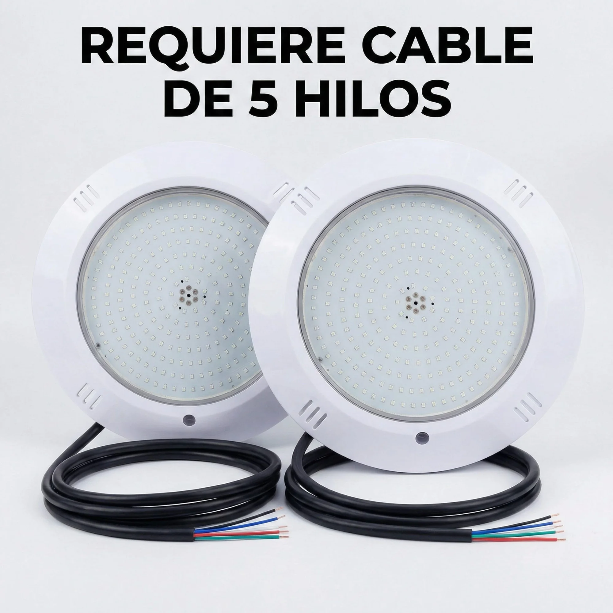 Para poder controlar el canal Blanco de forma independiente al Color, estos focos utilizan una manguera de 5 cables (Rojo, Verde, Azul, Blanco, Común +).