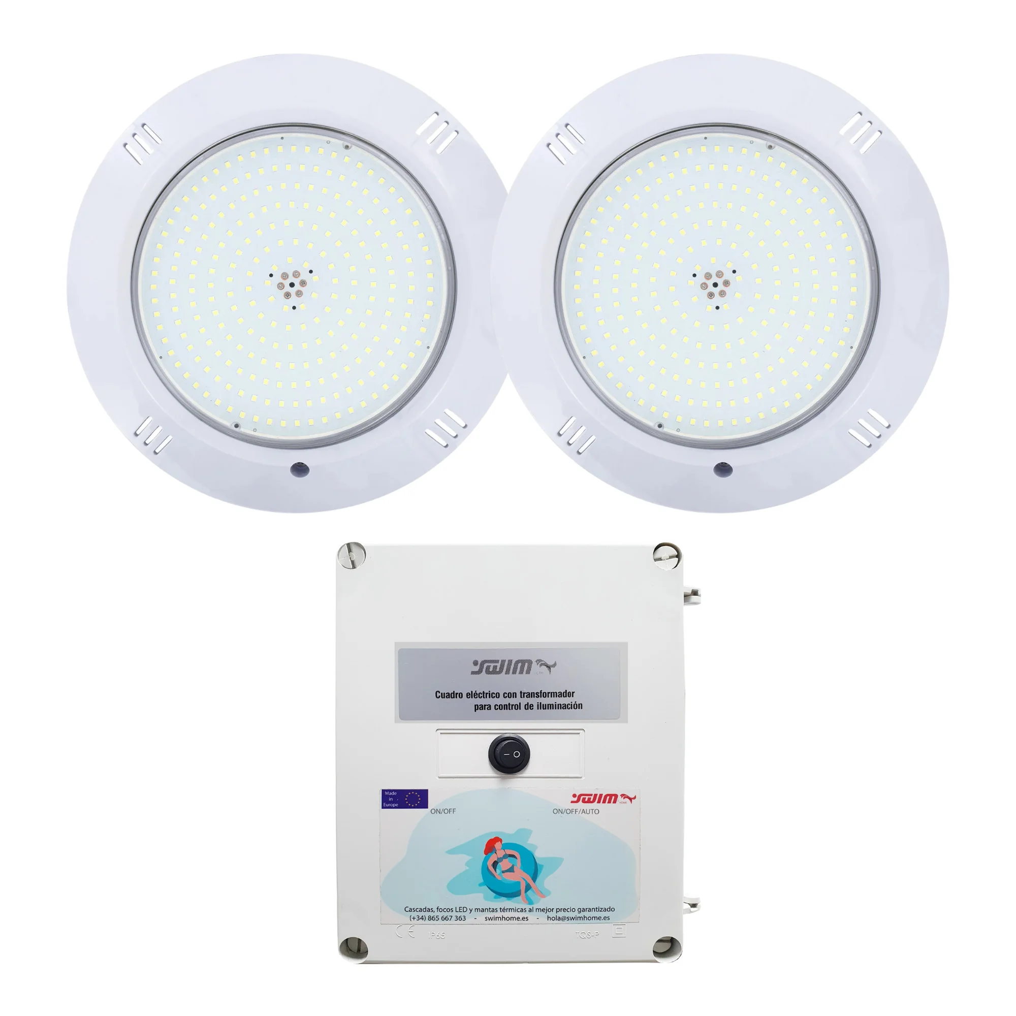 Cada pack viene con un cuadro con transformador de 12V AC con magnetotérmico y diferencial, asegurando una instalación eléctrica segura y eficiente, y una operación sin problemas de los focos LED en su piscina.