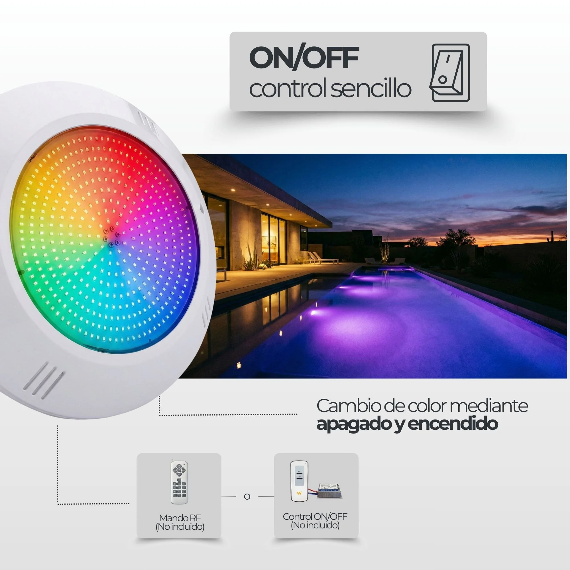 - Atornilla el foco, llena la piscina y prueba desde el interruptor o el reloj.