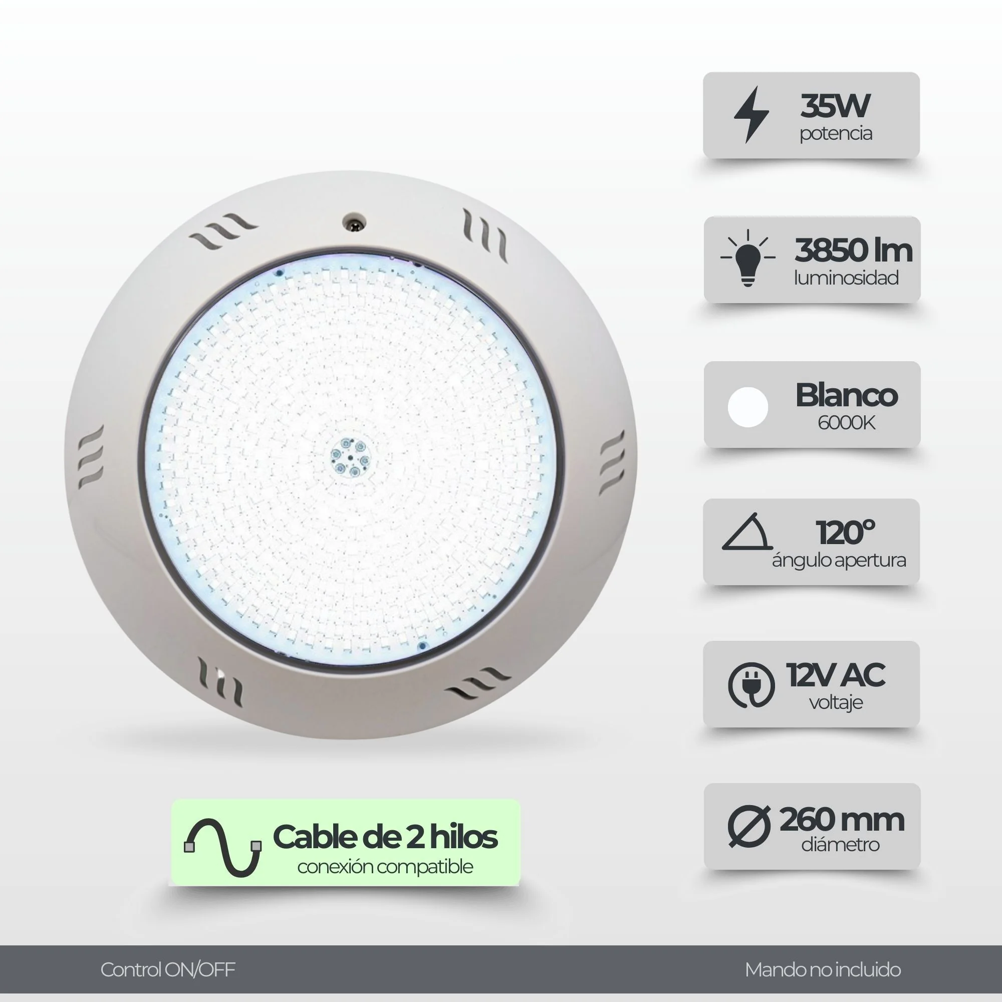Aporta una iluminación suave y acogedora a tu piscina con el Foco LED Blanco 35W para Piscina. Este foco está diseñado para emitir una luz blanco cálido de 3000K o frío de 6000K, perfecta para crear un ambiente relajante y atractivo en piscinas, estanques o fuentes. Su eficiencia energética lo convierte en la opción ideal para quienes buscan una solución de iluminación de alto rendimiento y fácil instalación.