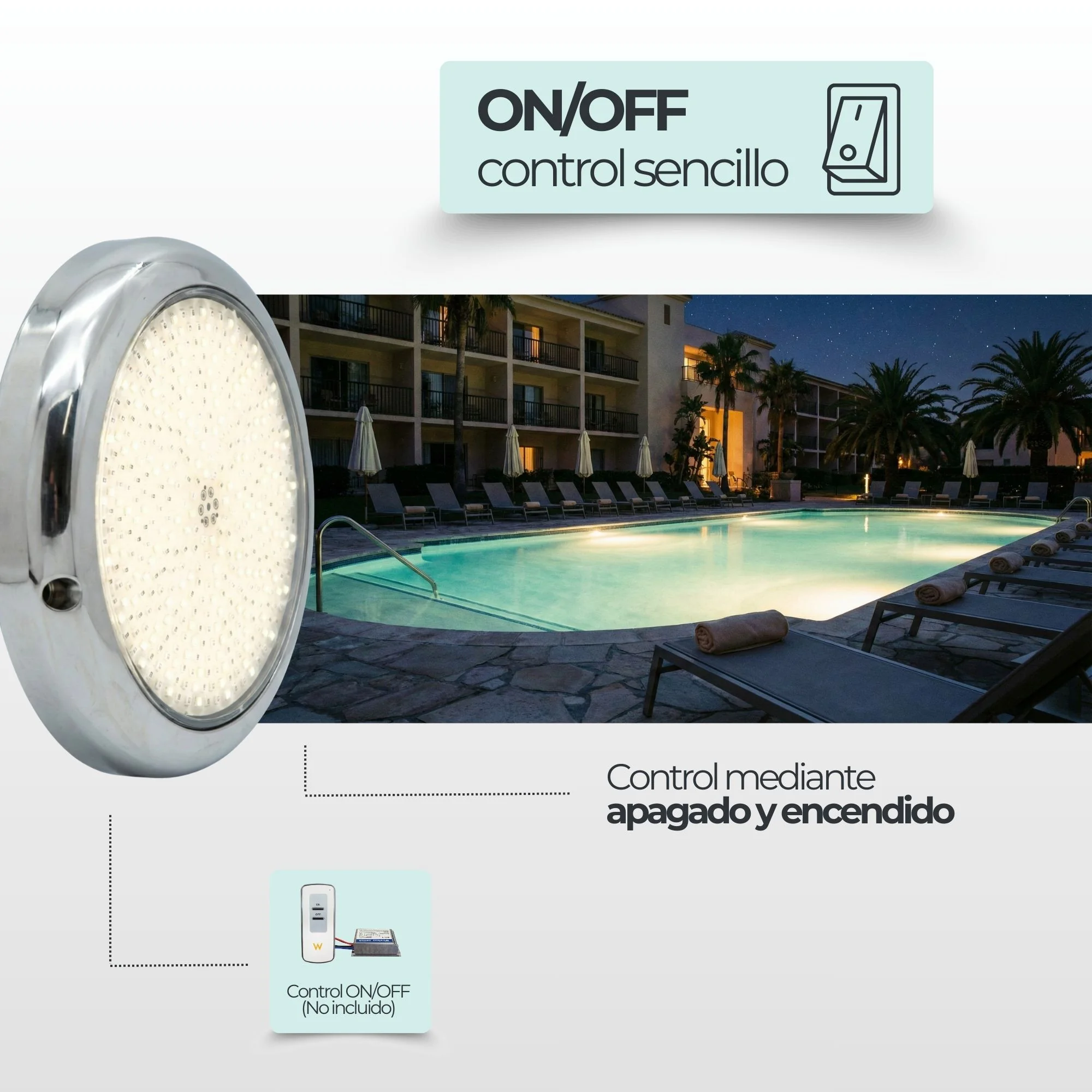 Este foco funciona mediante sistema ON / OFF, permitiendo su encendido y apagado de forma sencilla desde el interruptor de los focos, un interruptor a pared o un control remoto compatible.