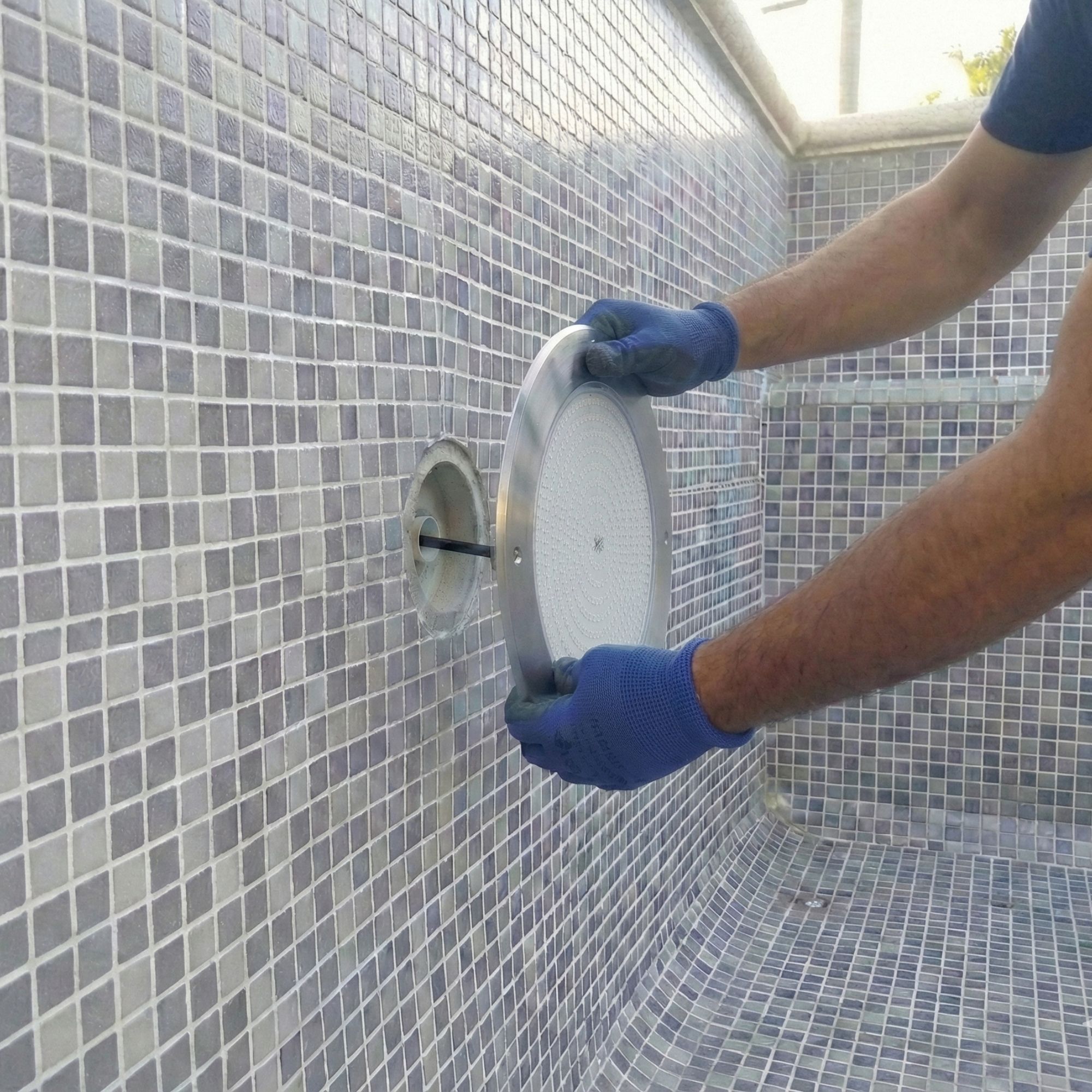 - Opción A (Conexión en el nicho): Se realiza un empalme estanco entre el cable existente y el cable del foco utilizando un conector IP68 (certificado para inmersión). El cable sobrante se enrolla y se guarda dentro del nicho previamente instalado. Posteriormente, se fija el foco atornillándolo directamente a la pared.