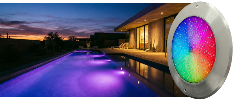 Depende del color que más le guste y si desea colores suaves o brillantes. Como guía, 1 foco cada 20–25 m² de lámina de agua (ajusta según color del revestimiento y altura).