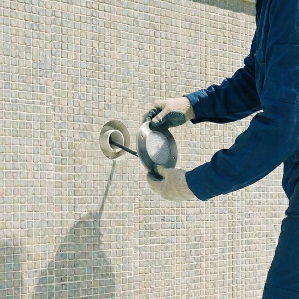 - Opción A (Conexión en el nicho): Se realiza un empalme estanco entre el cable existente y el cable del foco utilizando un conector IP68 (certificado para inmersión). El cable sobrante se enrolla y se guarda dentro del nicho previamente instalado. Posteriormente, se fija el foco atornillándolo directamente a la pared.