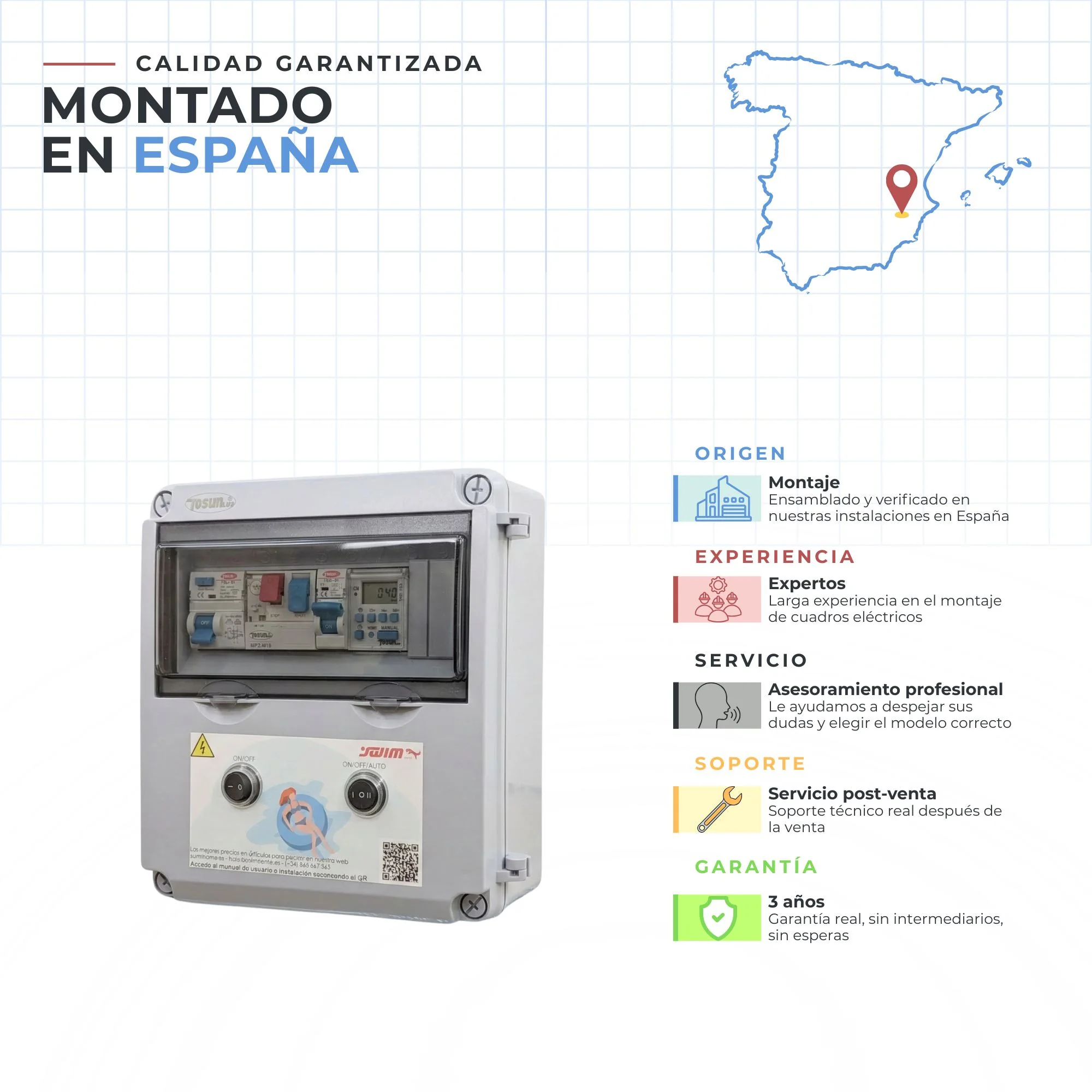 Notre tableau électrique de base avec transformateur de 50 W s'adapte à une grande variété de besoins et de configurations de piscines. Si une horloge analogique ou toute autre personnalisation est nécessaire, notre équipe est prête à vous aider. Nous fournissons une assistance complète pour que votre expérience avec notre produit soit exceptionnelle.