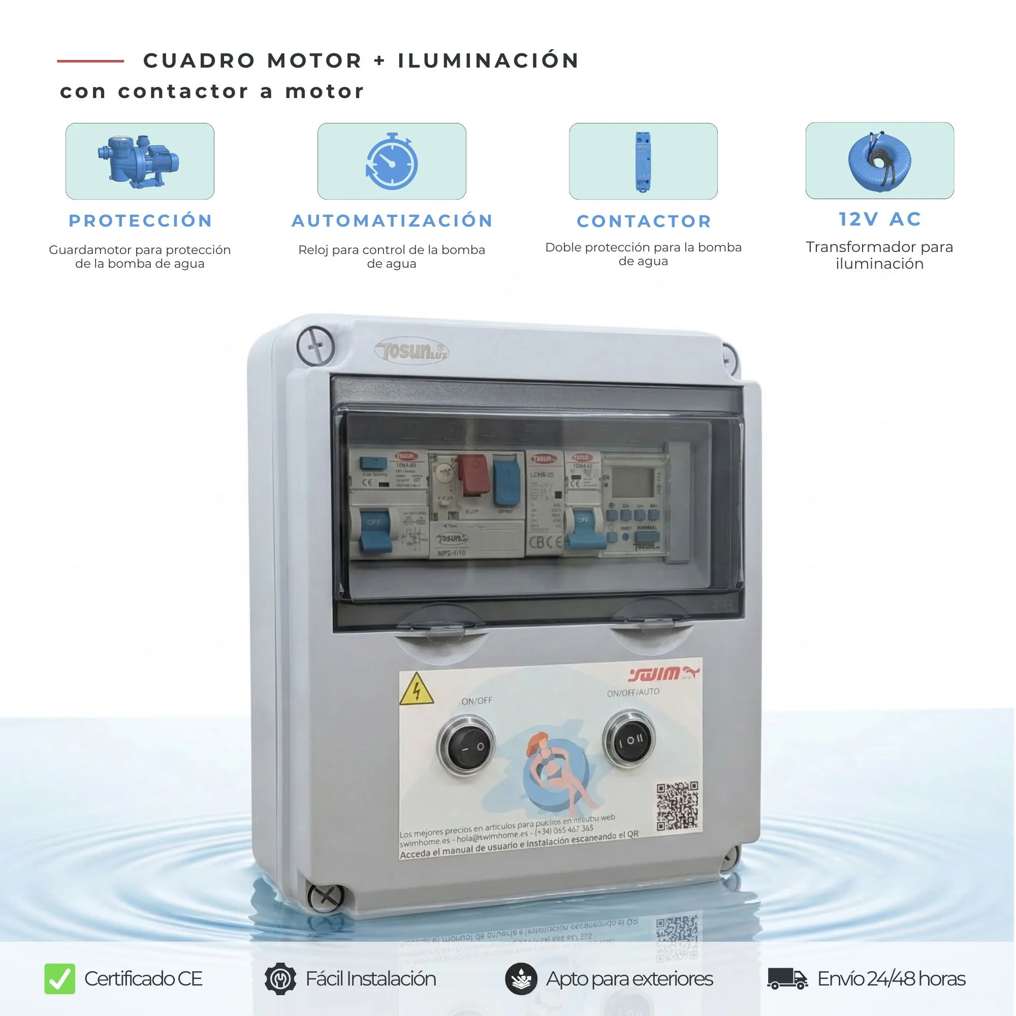 Nous vous présentons le tableau de commande à contacteur, spécialement conçu pour optimiser l'efficacité et la sécurité de votre piscine. Ce système compact et avancé comprend un protecteur de moteur et un transformateur 12V AC, fournissant une solution complète pour la gestion du moteur et de l'éclairage de la piscine.