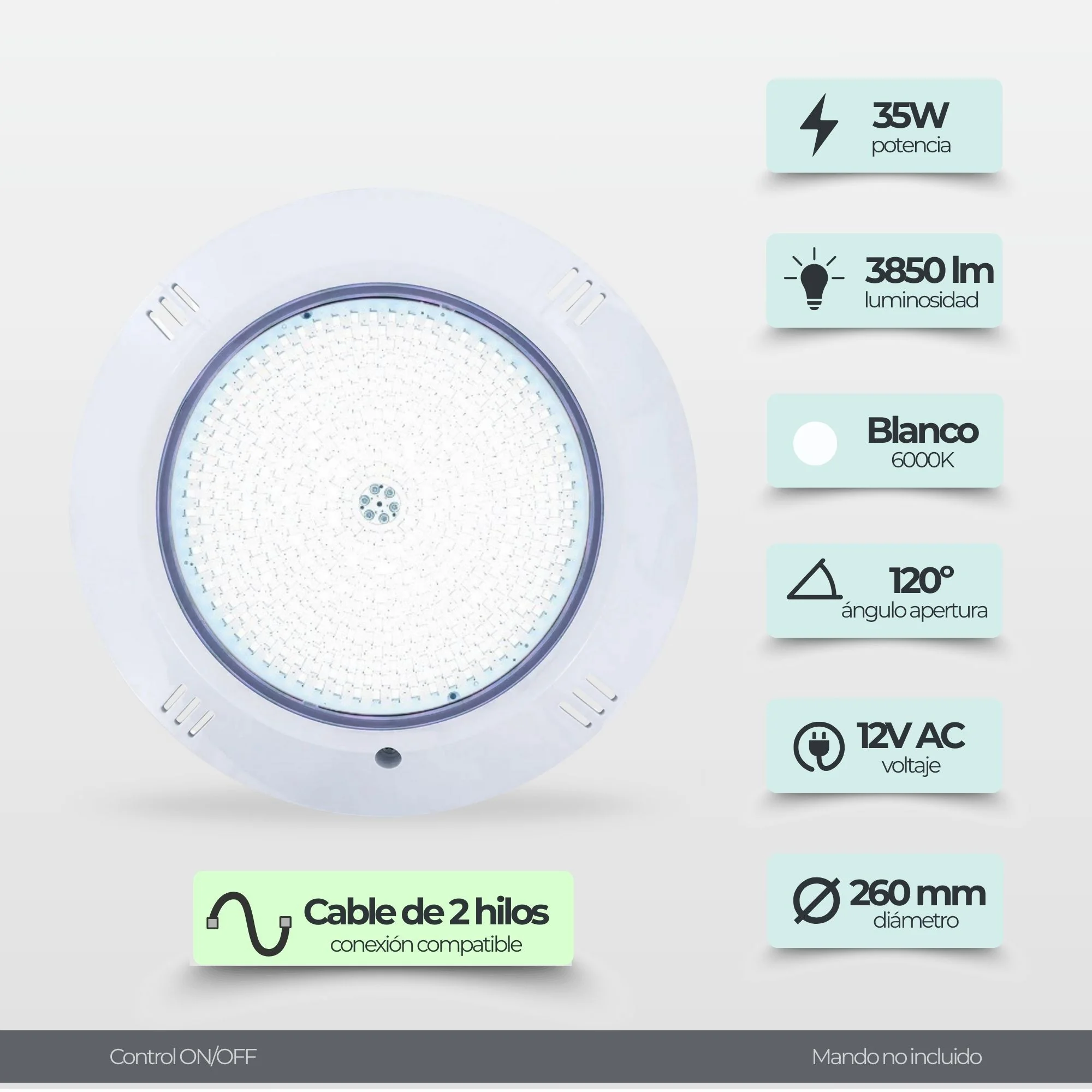Profitez d'un éclairage sous-marin performant grâce à l'éclairage de piscine LED 35W avec technologie Airless, disponible en blanc chaud (3000K) pour une ambiance relaxante ou en blanc froid (6000K ) pour une lumière plus brillante et plus nette. Ce projecteur est fabriqué en polycarbonate durable et utilise la technologie Airless, qui élimine les chambres à air internes pour éviter les fuites et améliorer la durabilité, même dans les piscines d'eau salée.