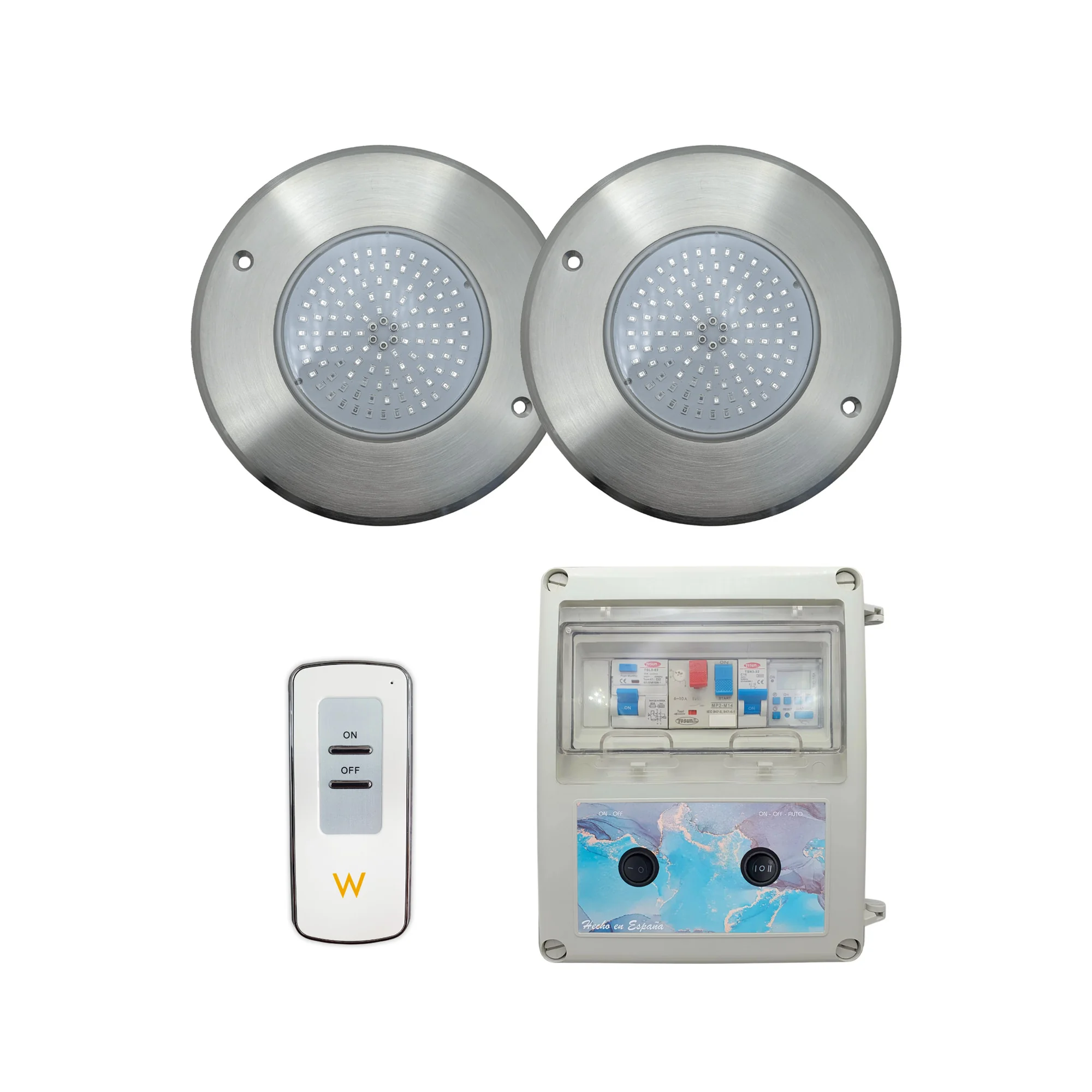Pack 2 spots LED Cool White Ø16cm ON/OFF 10W 12V AC en acier inoxydable avec panneau électrique