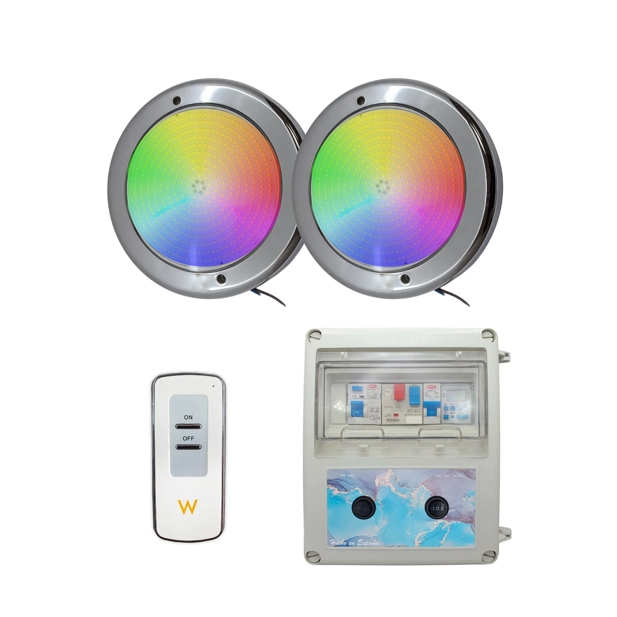 Pack 2 spots LED RVB Ø15cm ON/OFF 10W 12V AC en acier inoxydable avec panneau électrique