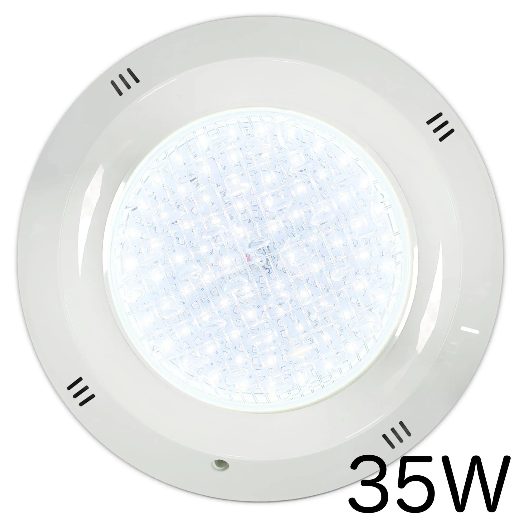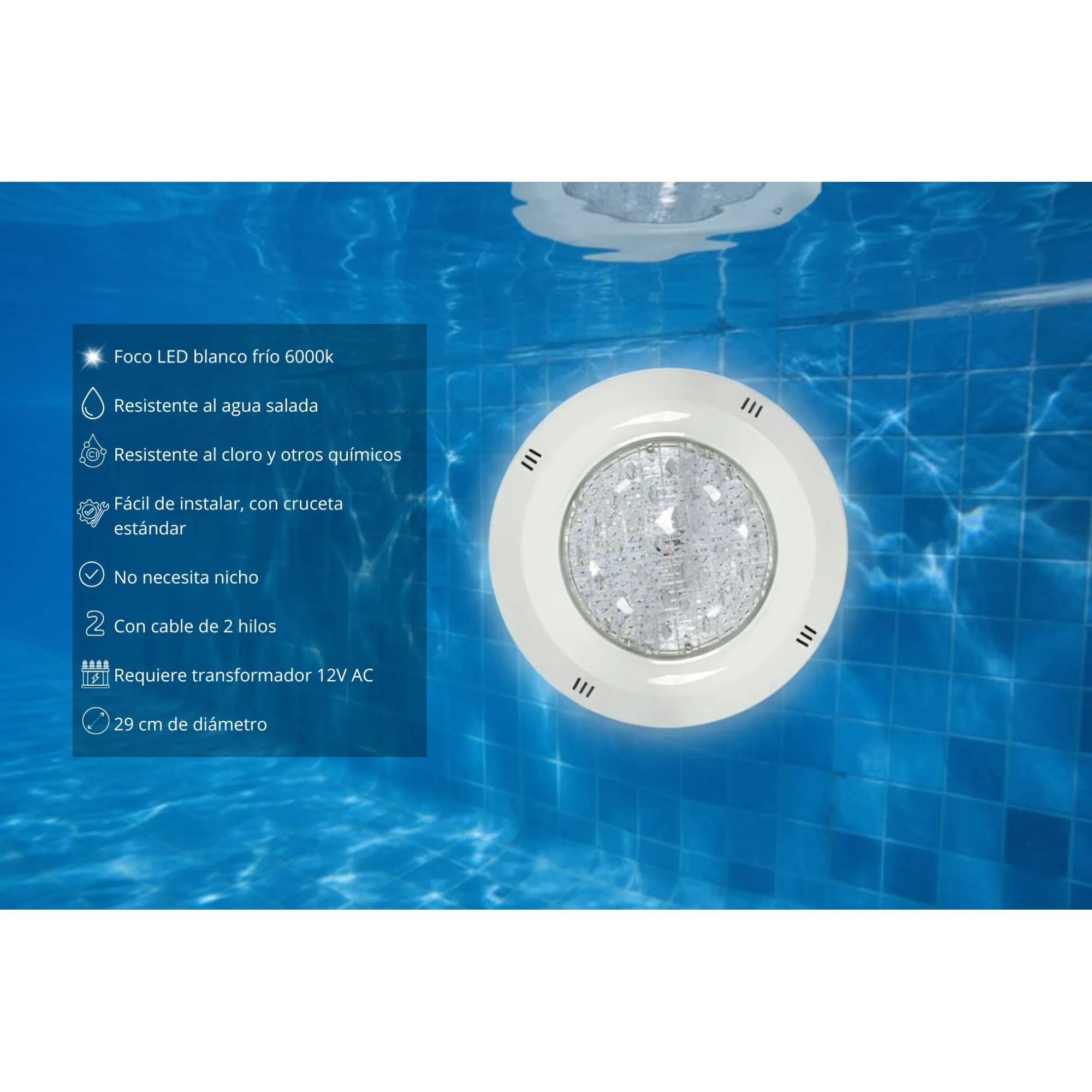 Light up your pool without building work. Surface-mounted 35W LED spotlight (12V AC) that screws onto the standard crossbar. Change it without emptying the pool and get a clear white light 6000K with 3,500 lm and IP68.