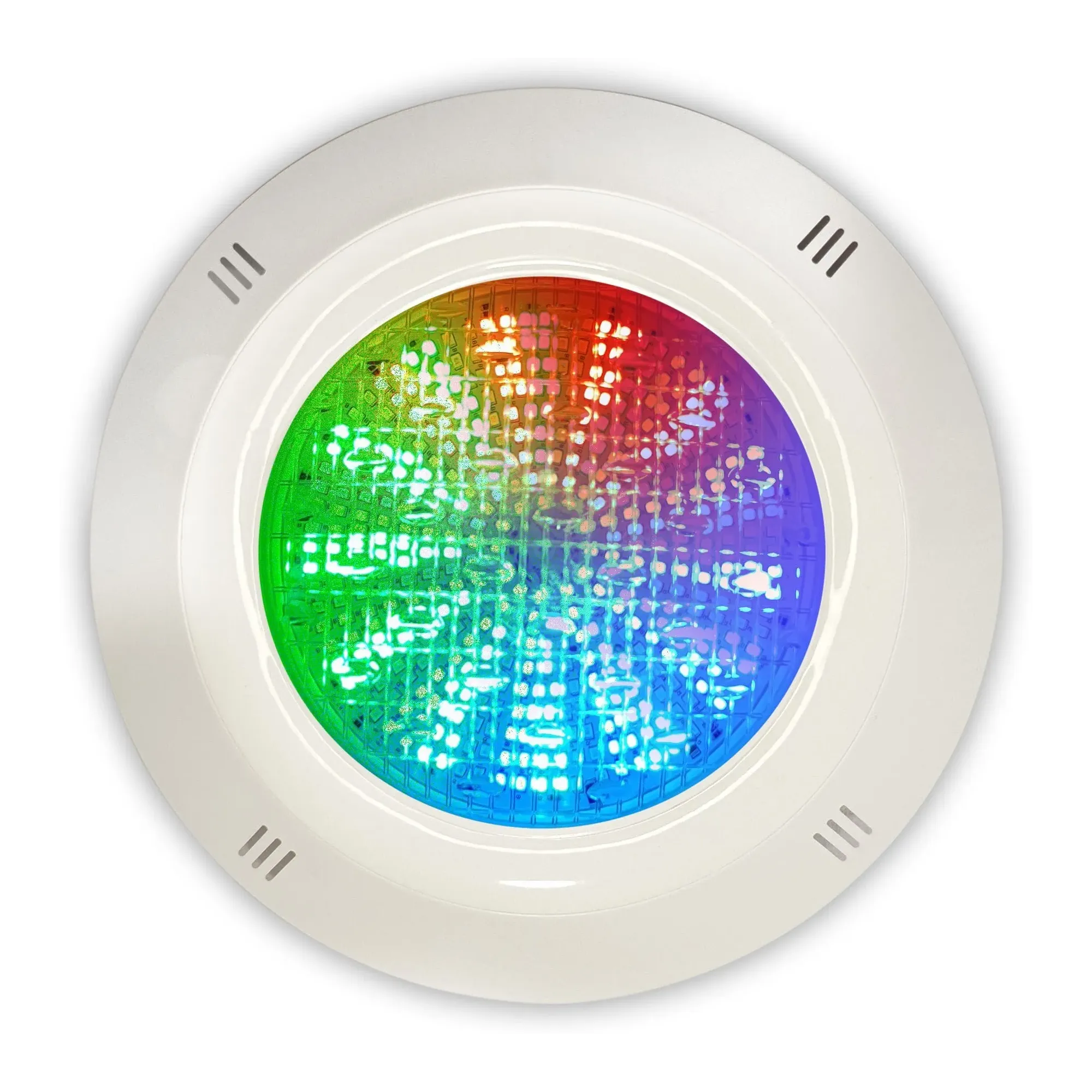 LED pool light with cross bracket. Replace your spotlight without emptying the pool if you use a standard 4-screw cross bracket. RGB and pure white lighting controllable with on/off or push button; add colour conveniently and safely. Optional remote control. With memory: compatible with clocks/timers and keeps the last colour or programme the next day.