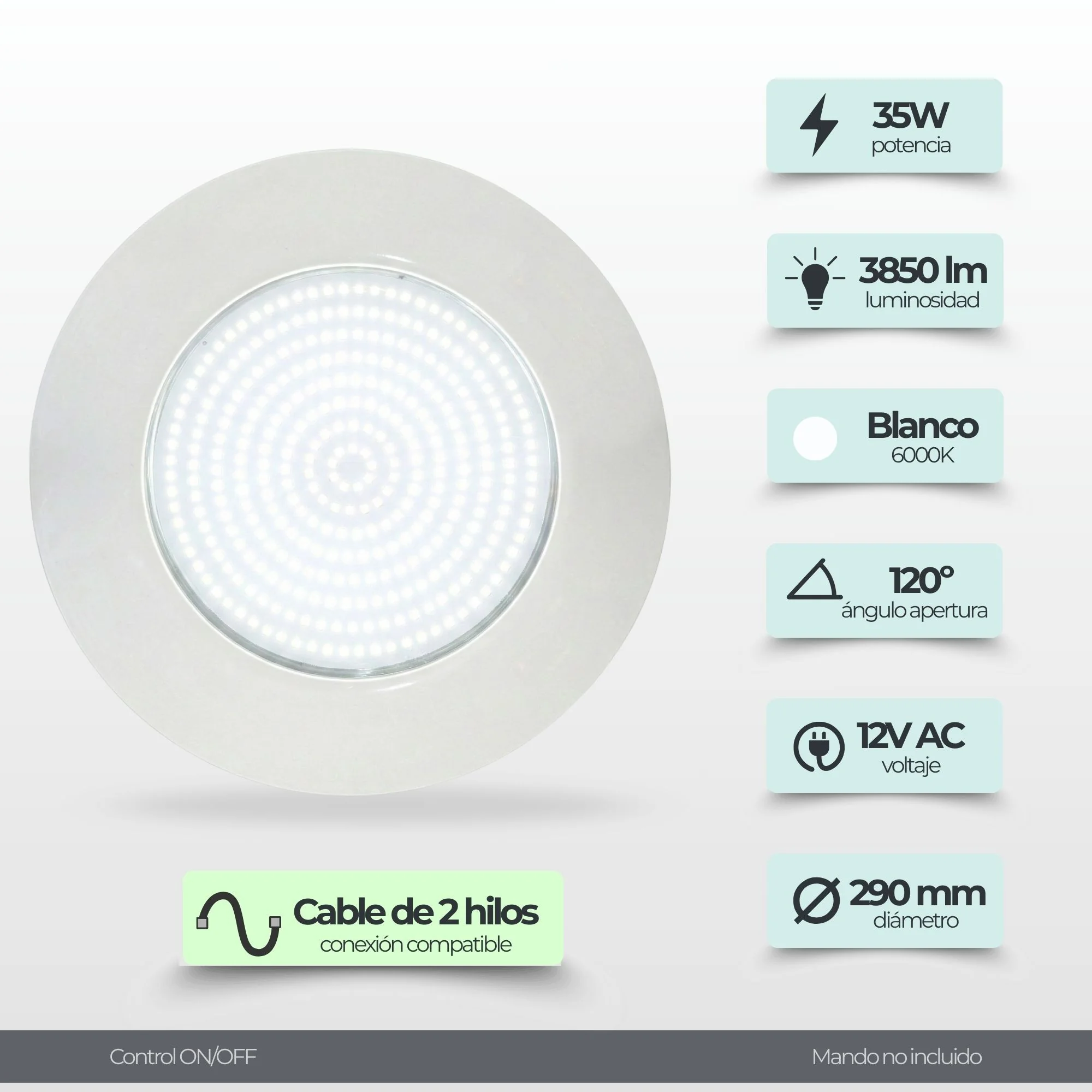 30W PAR56LED spotlight with floodlight for swimming pool niche. It is ideal for new installations or replacements of old halogen or LED PAR56 lamps. Its low consumption and its EPOXI resin filled system avoids the need to replace gaskets, and avoids breakdowns caused by flooding of the PAR56 housing. The new design is fully submersible, it can be completely wetted.