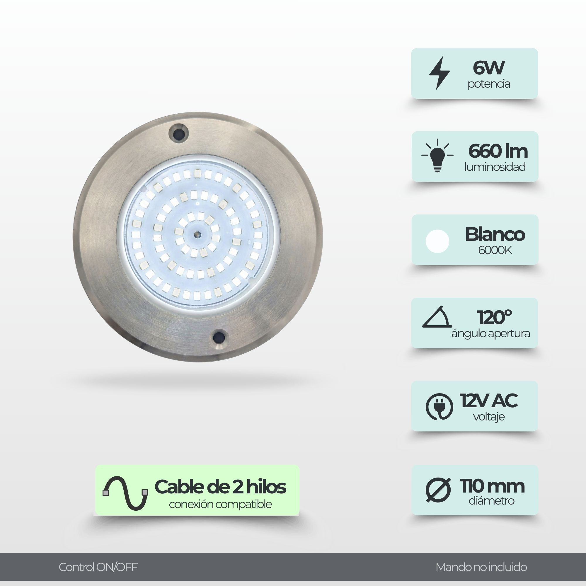 Foco LED Mini para Piscina en Acero Inoxidable Blanco 6000k 11 cm de diámetro 6W 12V/AC