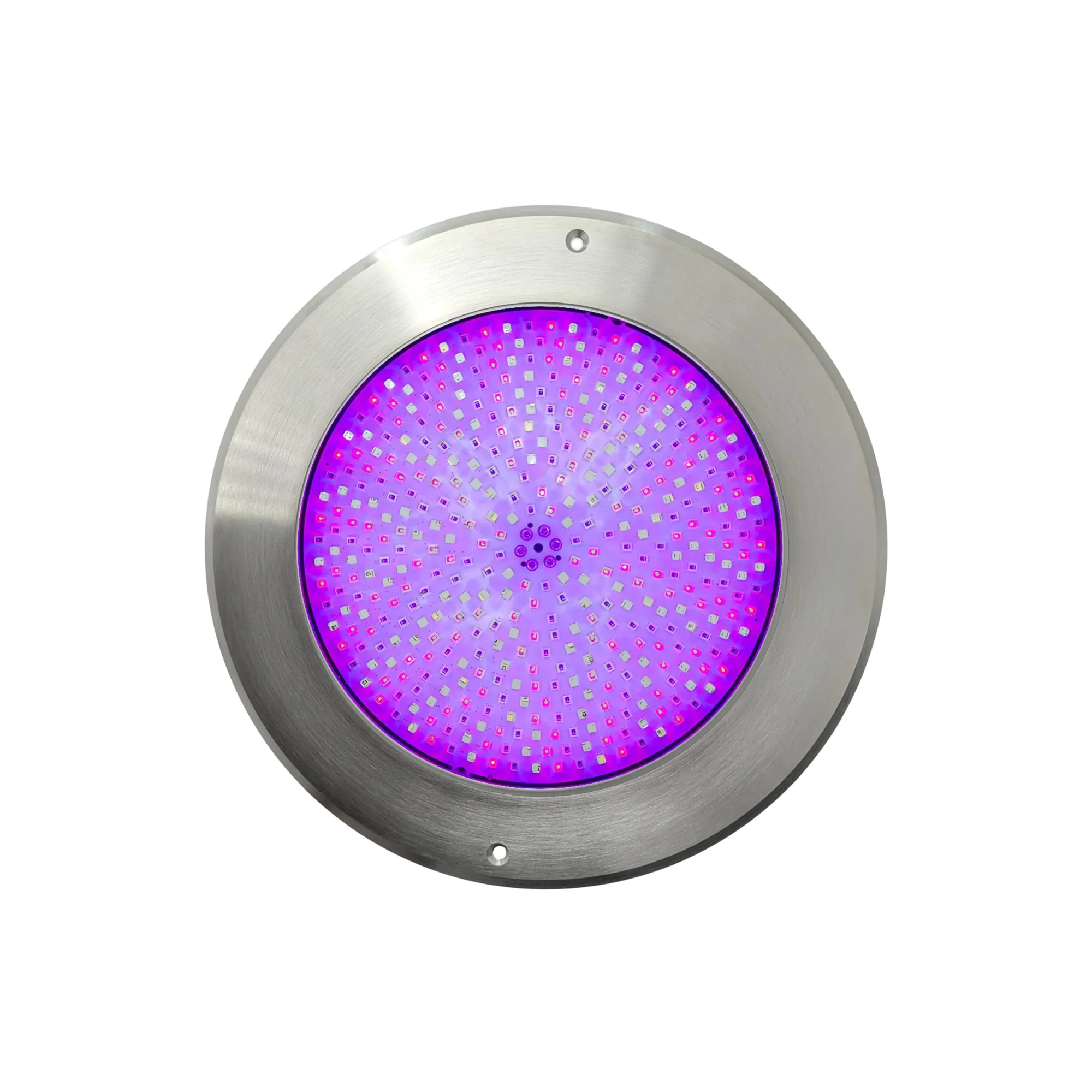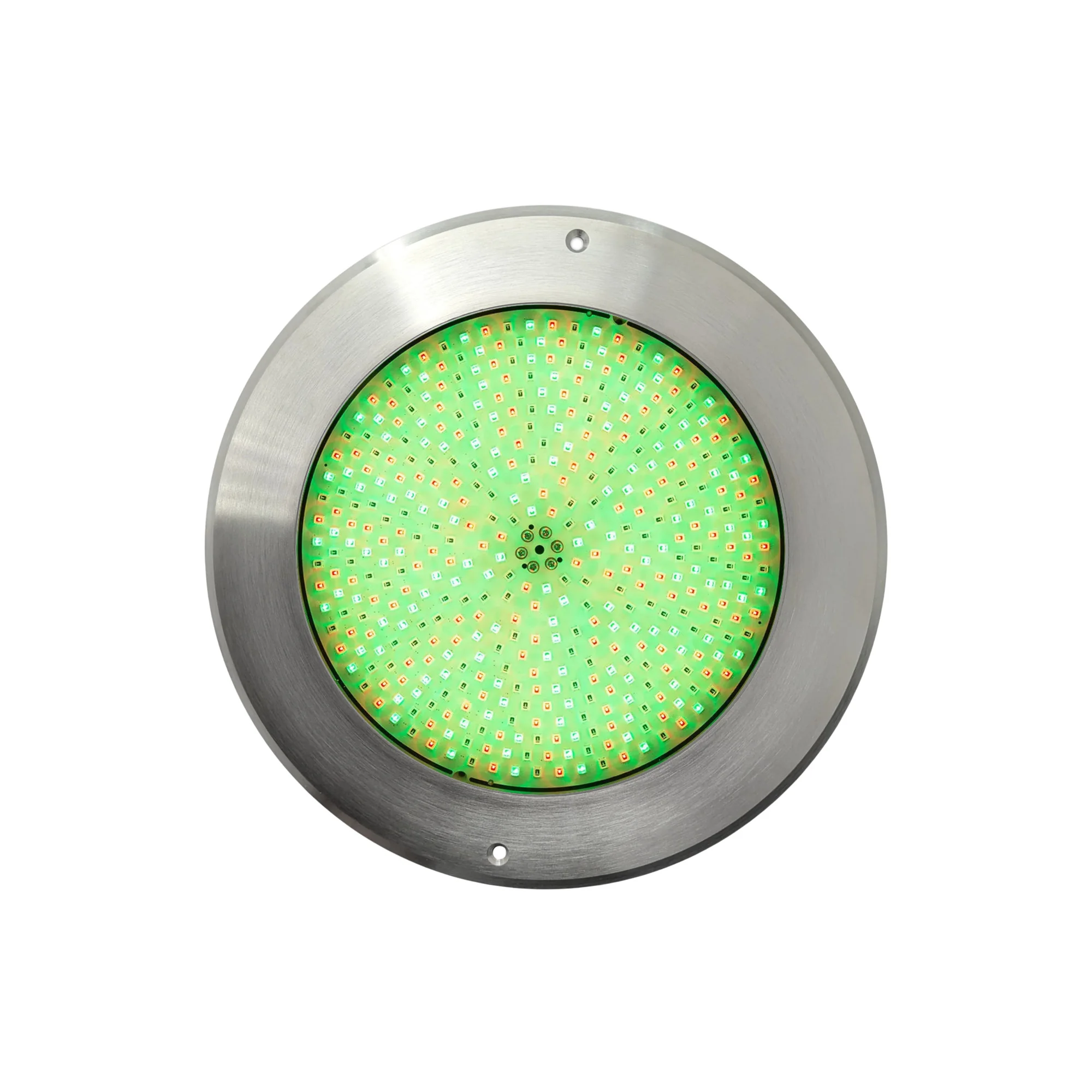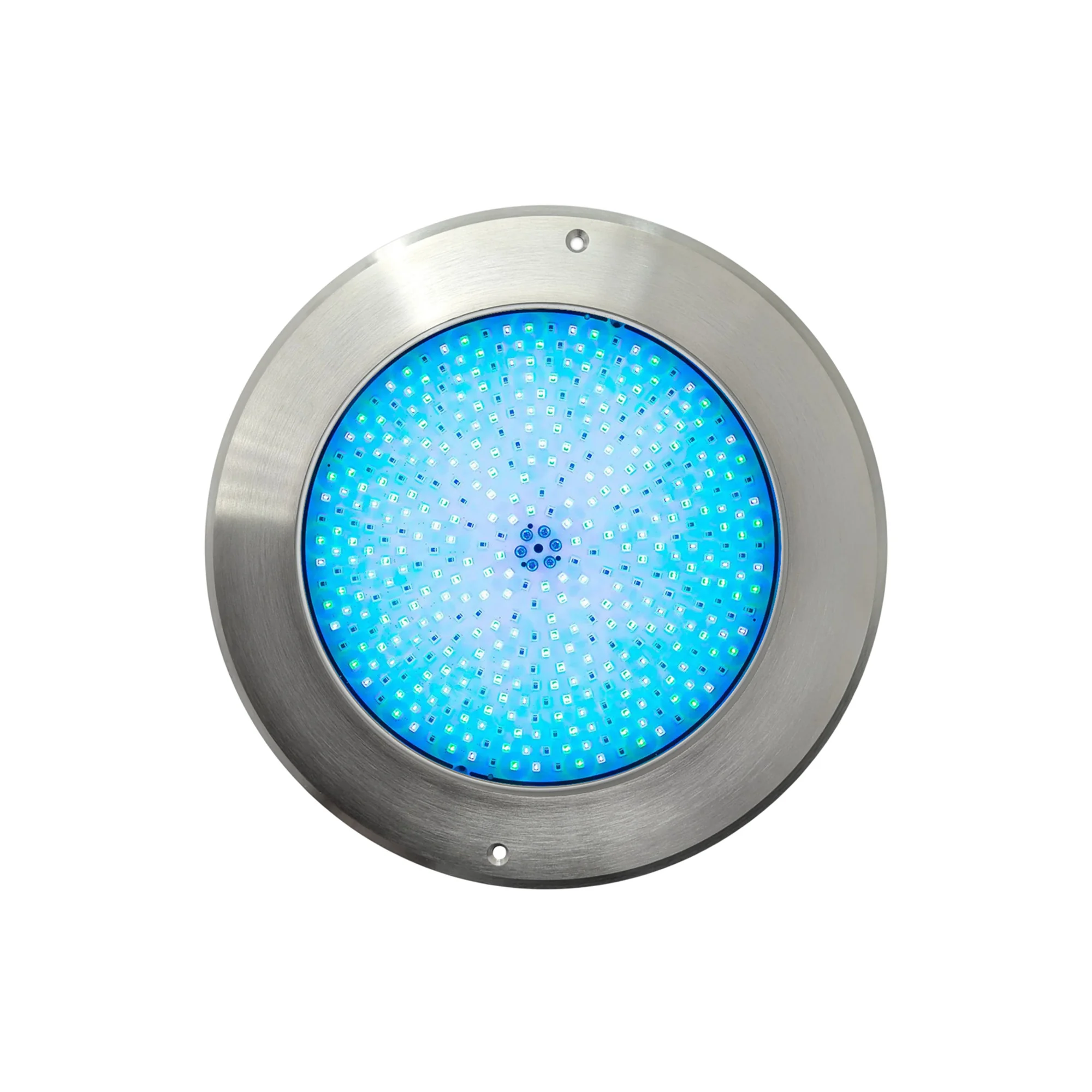 RGB stable and controllable with 4-wire cable (R/G/B + common) and 12V DC power supply. Ultra-thin format (~3 cm), AISI 316 stainless steel ring and surface mounting (requires niche or cable gland). Works with RGBV+ controller and WiFi control (App, Alexa, Google) via compatible controller.
