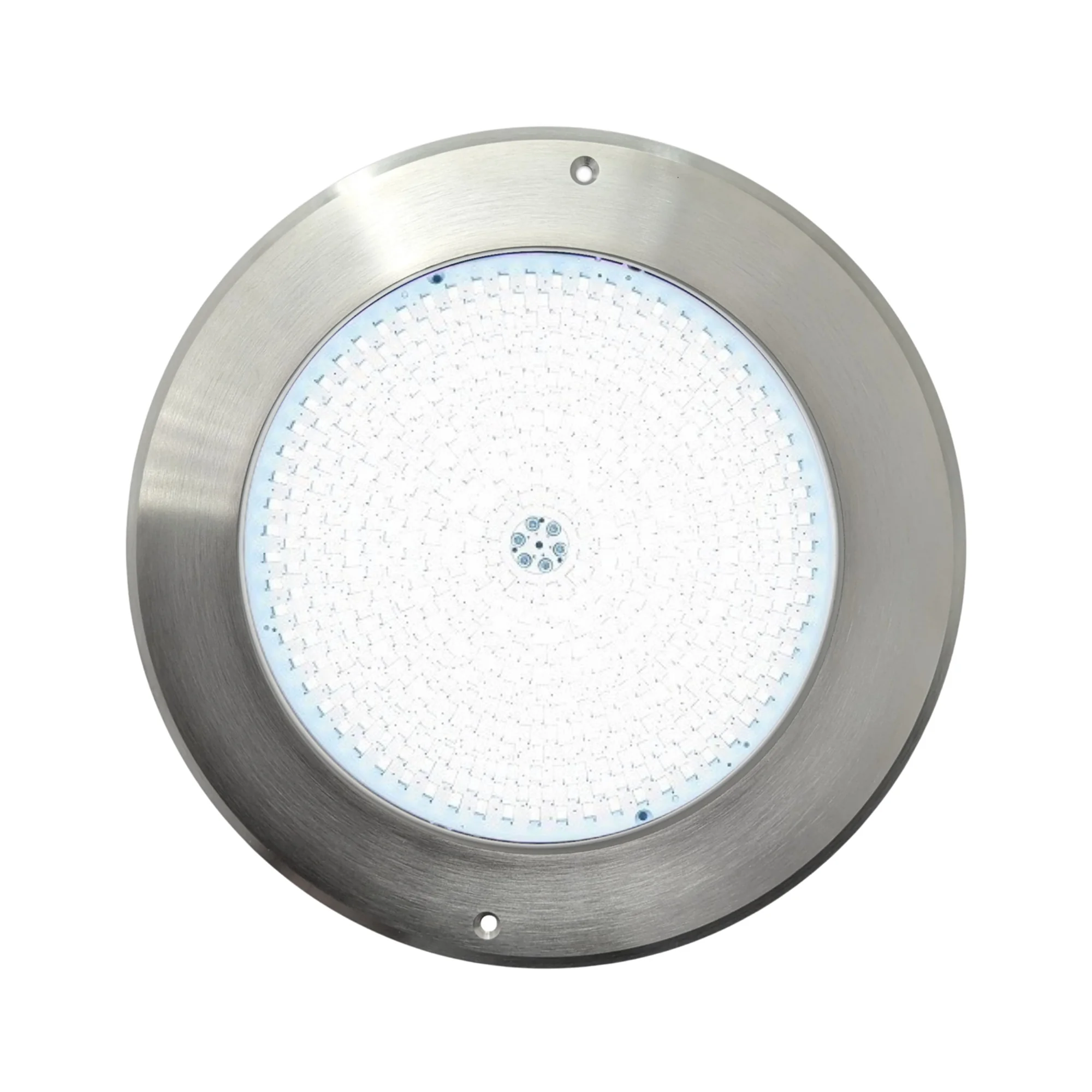 Iluminea sua piscina com um projetor fino de Ø28 cm e um anel em aço inoxidável AISI 316. O seu design sem ar (preenchido com resina) proporciona uma verdadeira estanquicidade e uma longa duração. Disponível em branco 3000K ou 6000K com até 3450 lm por unidade.