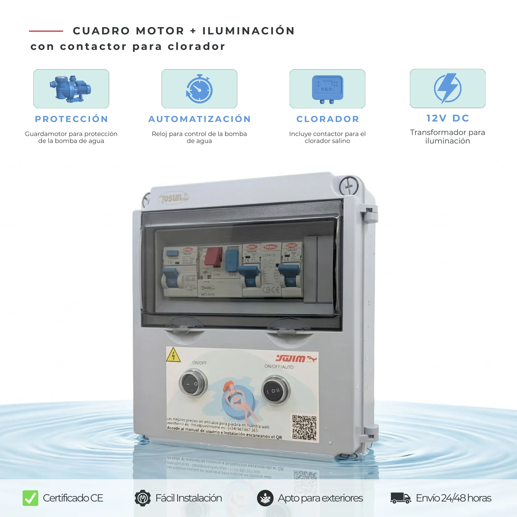 Damos prioridade à sua segurança e à eficiência energética. O transformador de 60W para 12V DC assegura um consumo mínimo de energia, enquanto as características de proteção, como o disjuntor para as luzes e a proteção do motor, garantem um funcionamento seguro e fiável. Este quadro elétrico é a solução perfeita para quem procura uma gestão energética eficaz e segura para as suas instalações de piscina.