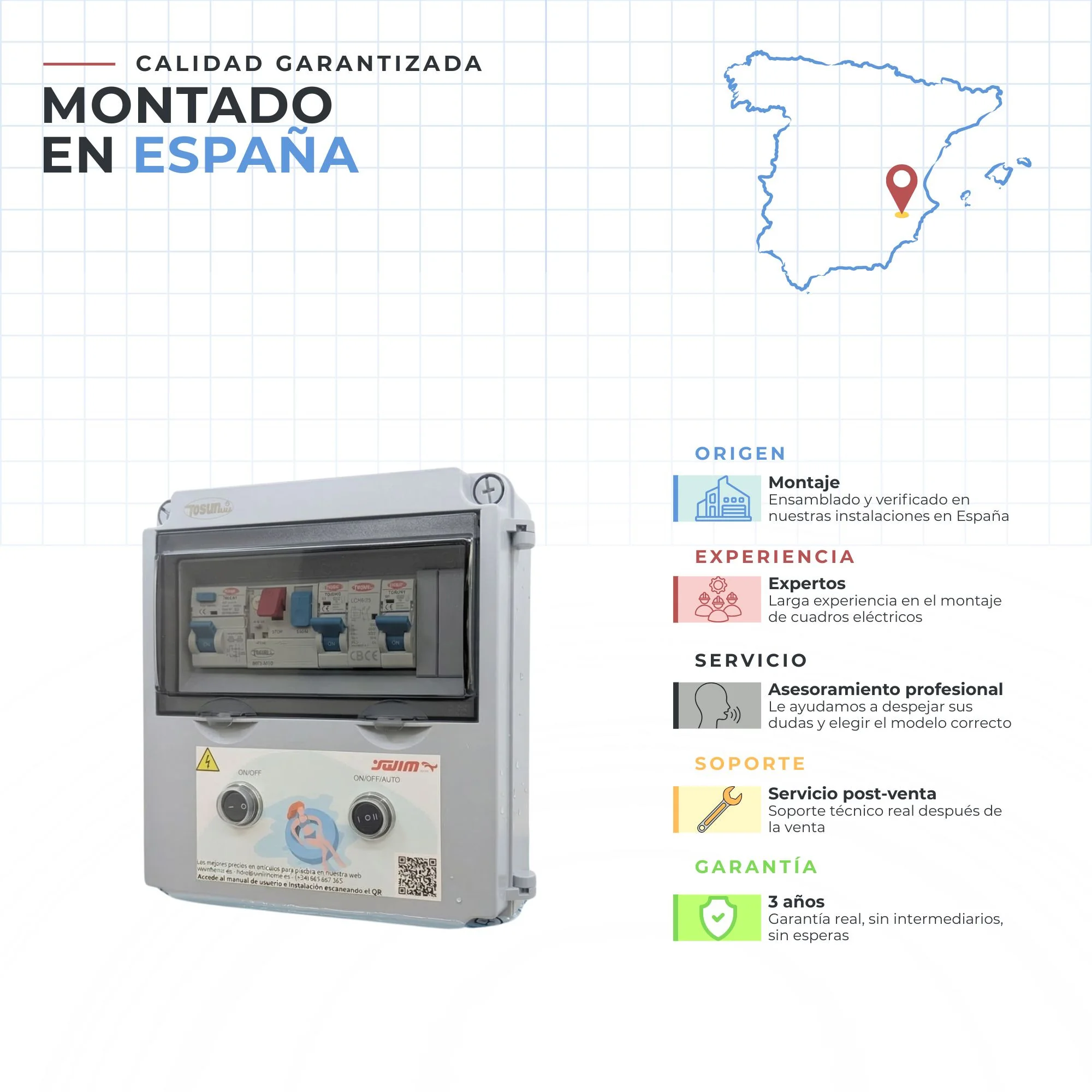 - Diferencial de segurança: Inclui diferencial de segurança para proteger o sistema contra fugas de terra. Evita danos nos equipamentos e nas pessoas graças a este sistema.